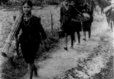 Đồng bào dân tộc Hrê phấn khởi trở về làng cũ sau khởi nghĩa Trà Bồng (tỉnh Quảng Ngãi), tháng 8/195