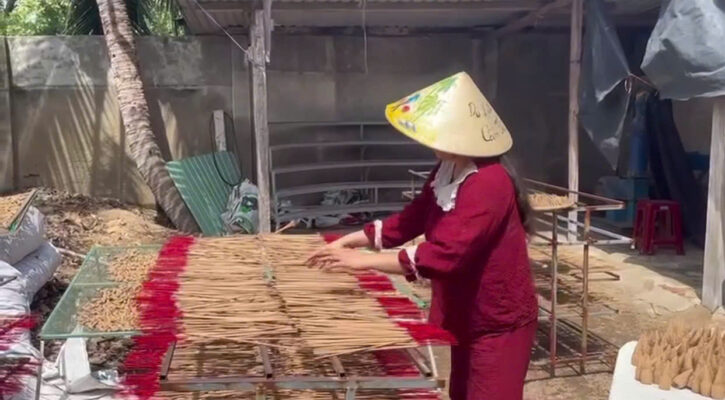 Sau khi thành hình, nhang cần được làm khô bằng cách phơi nắng là phương thức quen thuộc, liếp nhang trải trong sân, nắng “ăn” từ tốn để nhang khô đều để giữ trọn vẹn tinh dầu. Đây cũng là lúc “vai trò canh nắng” của người phụ nữ hiện ra rõ nhất. Họ nâng niu từng liếp nhang, xoay trở nhịp nhàng để nắng thấm đều, tránh việc nhang bị nứt nẻ hay ẩm mốc. Chính sự tỉ mỉ của các bà các mẹ đã giúp nhang trầm Vạn Thắng giữ được độ cháy đều, tàn nhang cuốn đẹp và mùi thơm thanh tao không lẫn vào đâu được. Khi nhang đã đủ độ khô và đượm hương, công đoạn cuối cùng là phân loại và đóng gói lại đòi hỏi sự kiên trì gấp bội. Những đôi tay thoăn thoắt lựa ra từng nén nhang cong vẹo, kiểm tra độ bám bột trước khi bó lại gọn gàng. Những việc làm ấy cho thấy tinh thần tận tụy, coi việc làm nhang như một quá trình rèn luyện sự nhẫn nại của những người con gái làng nghề nơi đây.