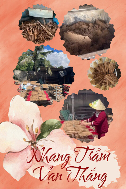 Đến khâu phối trộn bột, người làm nhang ở Vạn Thắng coi đây là đoạn khó nhất, bởi nó quyết định “cốt hương”. Bột trầm (từ phần gỗ phù hợp, nghiền mịn) thường được trộn cùng bột bời lời để tạo độ kết dính (Vỏ bời lời có chất nhầy, khi nghiền và phối với nước tạo độ dẻo dính, giúp se nhang, hạn chế gãy vụn)