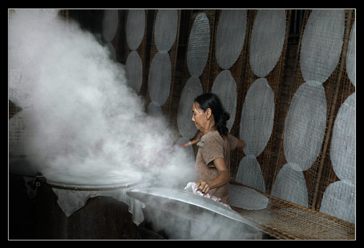 Với cách làm truyền thống, khi tráng bánh, người phụ nữ cần mẫn dùng gáo dừa múc từng vá bột gạo và tráng đều trên một tấm vải được căng sẵn trên miệng nồi lớn đang chứa nước bên trong, khiến bột thành lớp mỏng và tròn, rồi đậy nắp lại, chờ hơi nước làm chín. Ở công đoạn này, người thợ lành nghề phải rất tỉ mỉ và nhanh nhẹn mới thu được thành quả đạt chuẩn. Sau khi bánh chín, người thợ phải lập tức dùng một chiếc ống luồn dây ánh, gỡ ra trải lên một chiếc vỉ (hay còn gọi phên; liếp) được đan bằng tre đem phơi. Dưới cái nắng gay gắt của miền Nam, ta thấy thấp thoáng bóng dáng của người phụ nữ Việt Nam – thầm lặng, bền bỉ canh từng lớp bánh, phơi từng tấm tráng – công việc tưởng chừng đơn giản nhưng đòi hỏi sự chính xác đến từng chi tiết.