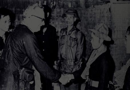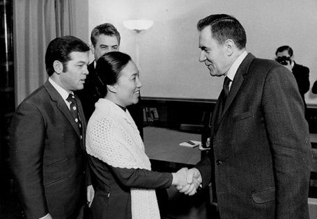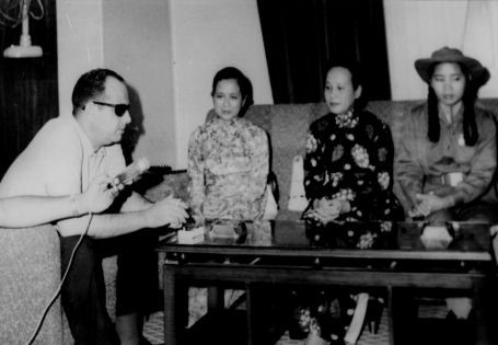 Ông Rudolf Mecchini – Chủ tịch Liên đoàn Thanh niên Dân chủ thế giới lắng nghe bà Nguyễn Ngọc Dung (mặc áo dài bông) – Ủy viên Ban chấp hành Trung ương Hội Liên hiệp Phụ nữ Giải phóng miền Nam Việt Nam trao đổi về công cuộc chiến đấu của Thanh niên miền Nam.