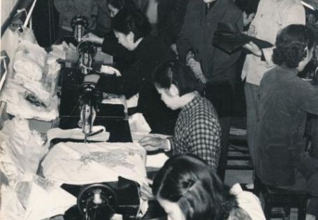 Bà Nguyễn Thị Thập thăm tổ gia công may mặc của phụ nữ khu phố Thượng Hải, Trung Quốc, năm 1964.